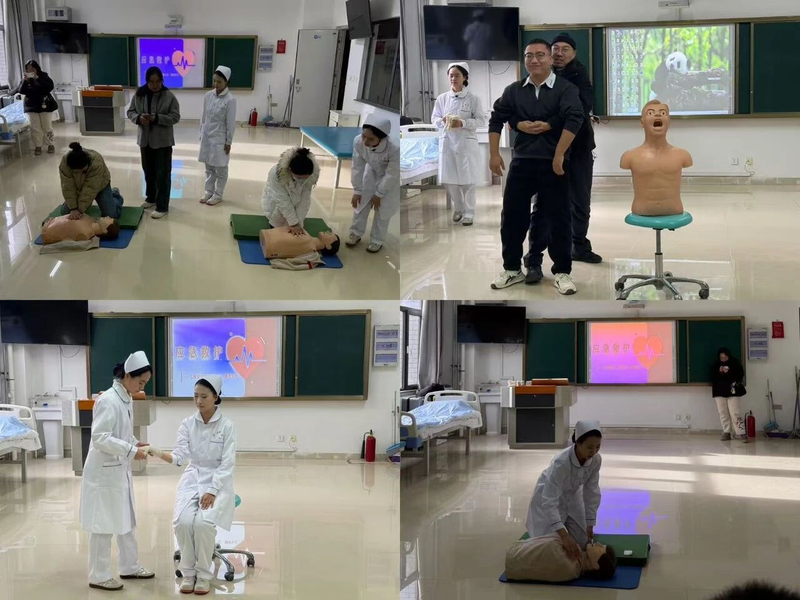 最后,大家一同参观了河套学院的全国科普教育基地。基地内丰富的医学展品和人体模型,生动呈现了基础科学原理与前沿科技应用的魅力。在“应急救护技能实训”环节,专业救护人员清晰演示了心肺复苏(CPR)的标准流程、操作要点;生动讲解了气道异物梗阻(海姆立克急救法)的急救手法;演示了不同部位创伤的绷带包扎技巧。讲解结束后,党员干部们在专业人员的指导下踊跃参与互动,轮流上场进行实操演练。